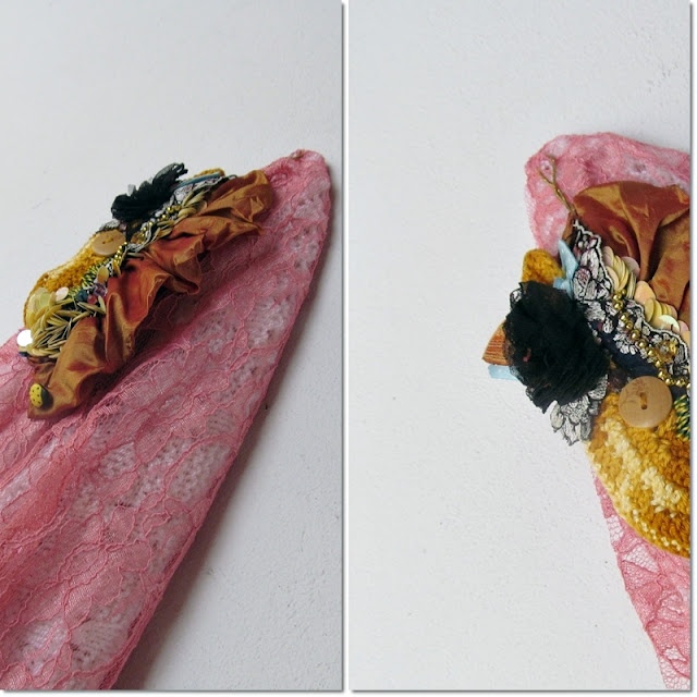 Um aproveitamento de rendas retalhos e bugigangas que enchiam potinhos por aqui...foi só juntar o que achei em loucos bordados que reuni com lantejoulas ,miçangas,fitas de bordado inglês,flores de tecidos em pregueados de cetim e rendas.